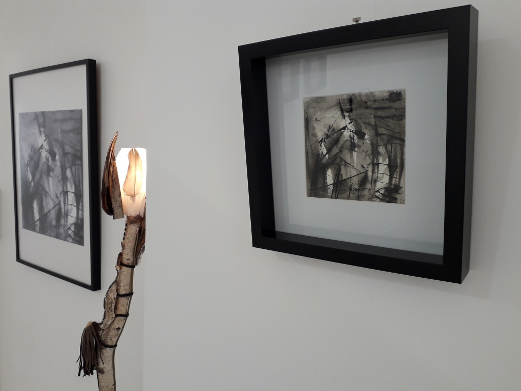 Il y a les « bâtons de lumière », qu’on n’appellera pas sculptures mais « travaux en volume » : branches, coquillages, plumes d’oiseaux s’assemblent pour des pièces toutes en verticalité. Sachez qu’ils portent des ampoules et qu’ils se branchent, si on le souhaite, pour devenir lumineux.