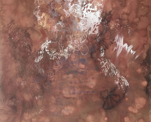 De retour à l’atelier, j’imprime mes photos et au mur je les rapproche de mes productions dessinées, peintes, modelées. Partant de là, je développe les jonctions entre mon monde intérieur et les silencieuses dynamiques du vivant, que le monde biologique produit en permanence.